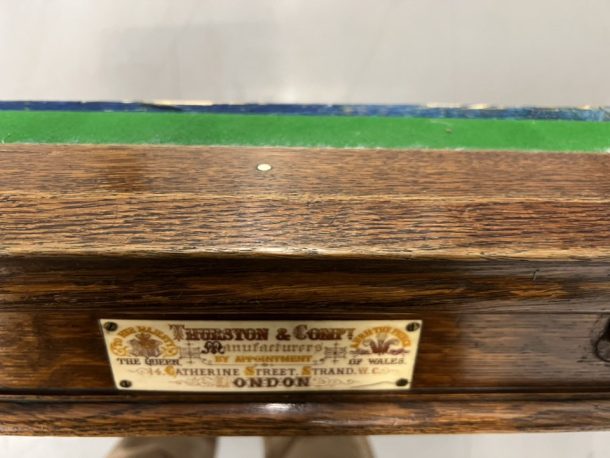 Very rare to find one as good condition as this in OAK , most are Mahogany I would say only 10% where made in Oak . With a very good well known billiards firm of Thurston’s manufacture . one of the best and still surviving Billiards firms that was founded in 1799 . This one is one of the original 4 piece 1 inch thick slate bed type which dates this table to around the 1880s period . maybe the back end of 1870s ?